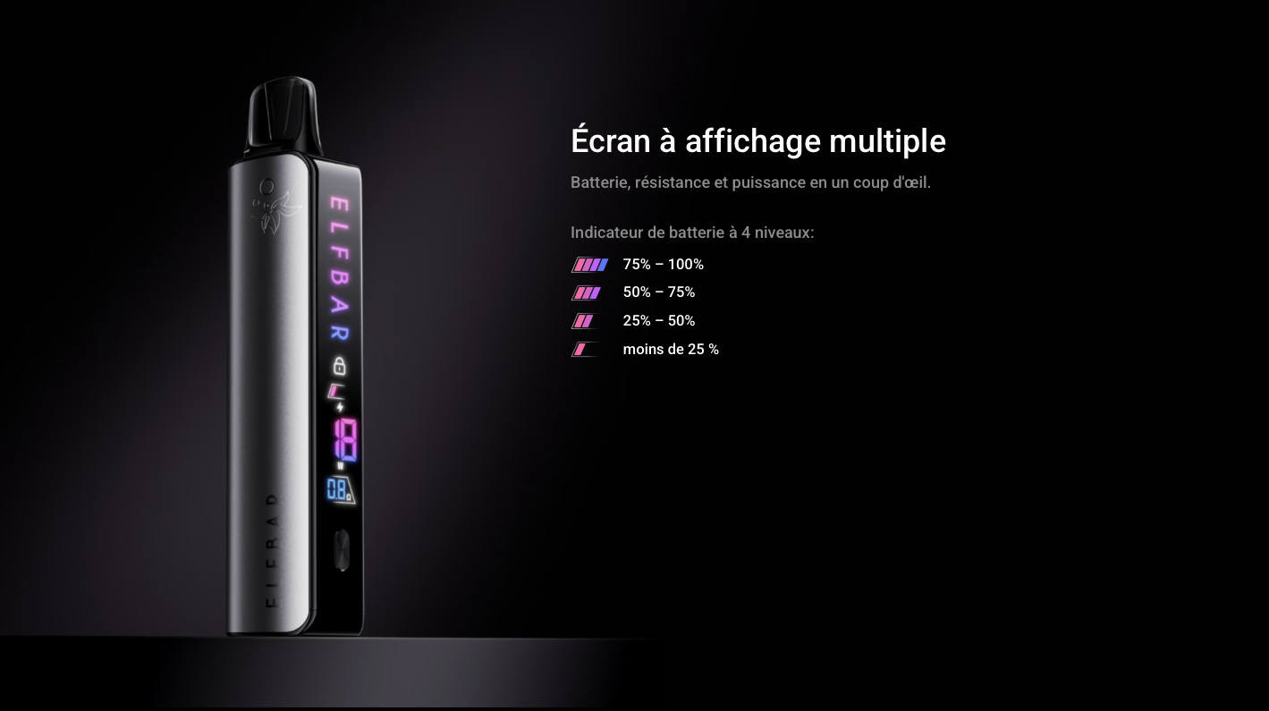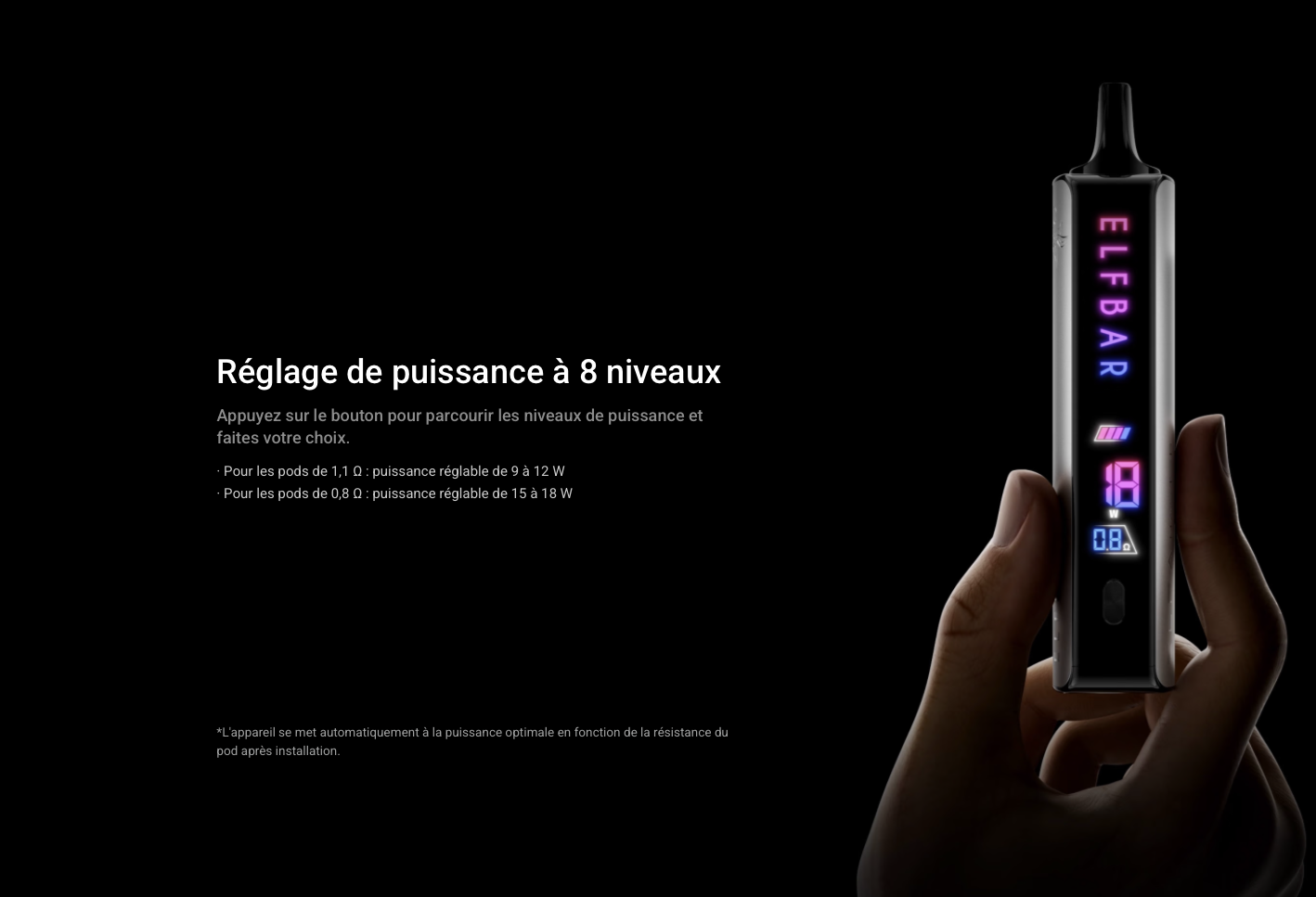 Bouton frontal pour ajuster la puissance. Avec cartouches ELFA Pro (1,2 Ω ou 0,8 Ω pré-remplies) : 9 à 12 W. Avec cartouches ELFA Turbo remplissables (0,8 Ω) : 15 à 18 W pour une vape plus intense et savoureuse.