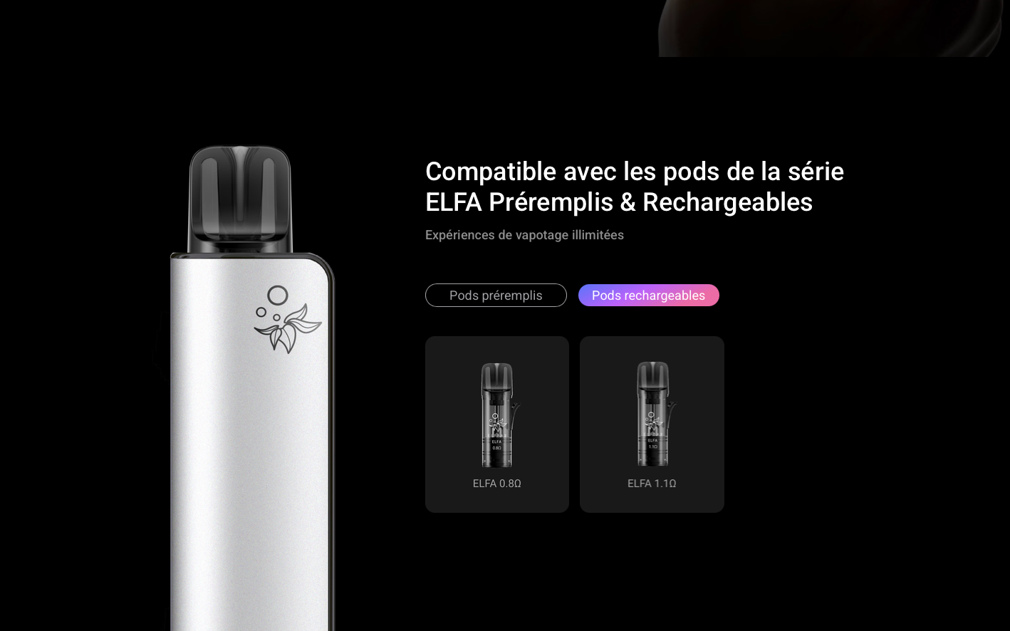 Compatible avec les cartouches ELFA Turbo remplissables (2 ml, languette silicone), les cartouches ELFA Pro pré-remplies dans plus de 30 saveurs (sels de nicotine 10 ou 20 mg) et les Lost Mary Tappo Prefilled Pods. Un seul appareil, une infinité de possibilités.