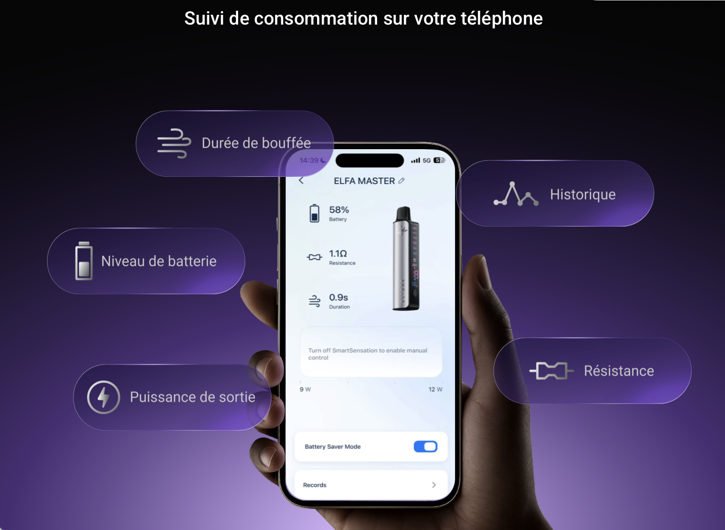 L'Elfa Master se synchronise en Bluetooth à l'application InnoGate. Personnalisez la courbe de saveur SmartSensation (début, milieu et fin de bouffée) avec une régulation de puissance toutes les 0,01 seconde pour une bouffée unique et précise.